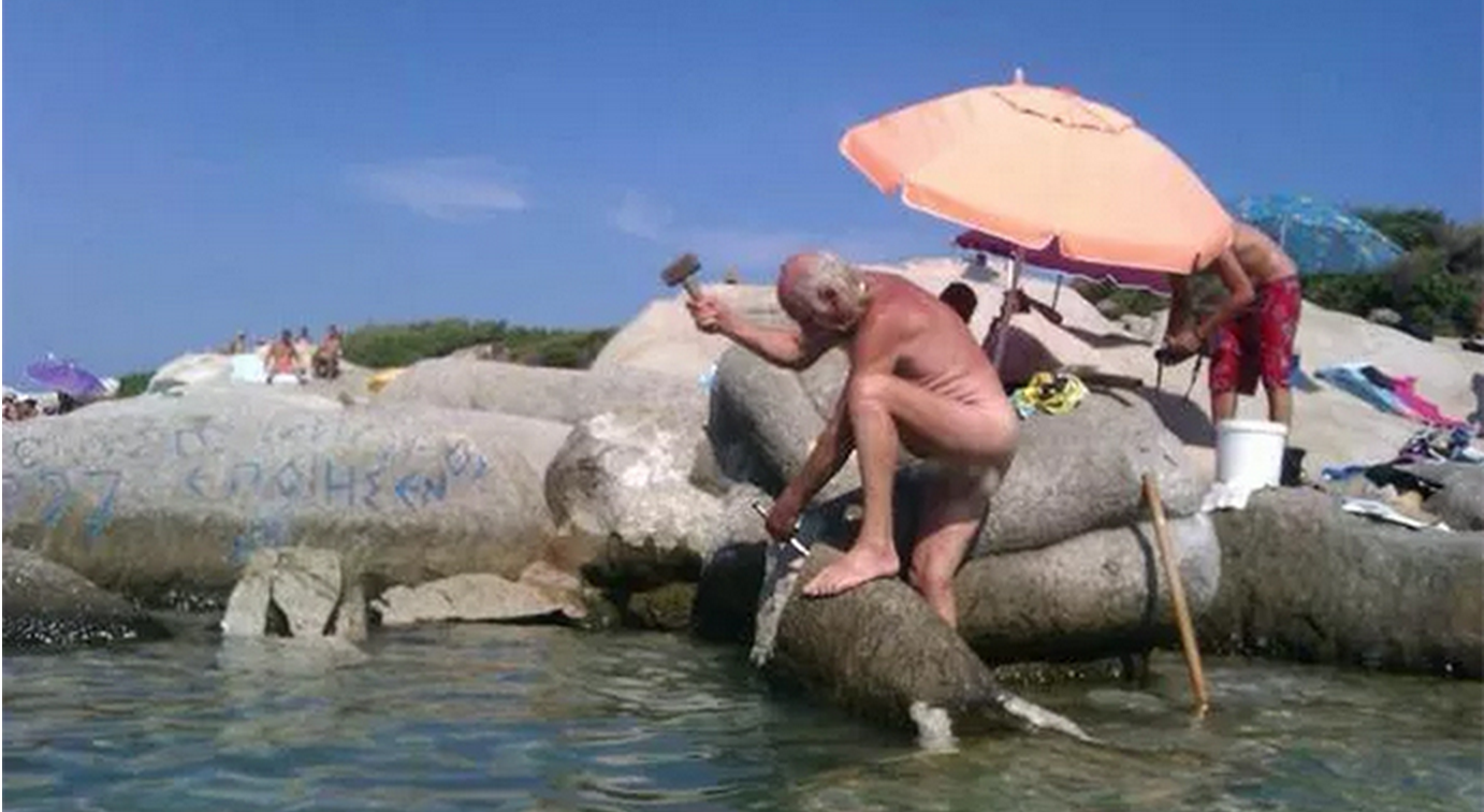 In 1997, Karipydis had carved a statue of mermaid into the rocks of a Portokali beach in Greece. The artist was issued a fine. To protest against this fine Karipydis took a sledge hammer in his hand and smashed the face of the mermaid.